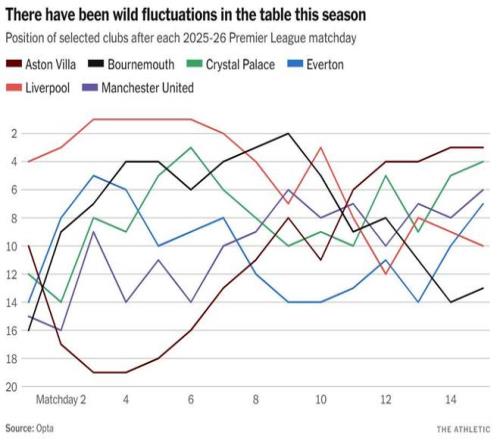 欧冠资格区已被12支不同的球队占据过,直到最近一轮比赛之前,还没有任何一个比赛周能保持前五名球队与上周完全相同。即便那次,各队位置也并非一成不变。阿森纳在15轮中有10轮位居榜首,但即便他们,也在沉重的伤病压力下显露出动摇的模糊迹象。