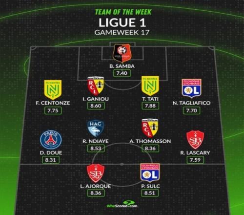 中场:杜埃(巴黎,8.31分)、拉索尔·恩迪亚耶(勒阿弗尔,8.53分)、阿德里安·托马森(朗斯,8.36分)、雷米·拉博·拉斯卡里(布雷斯特,7.59分)