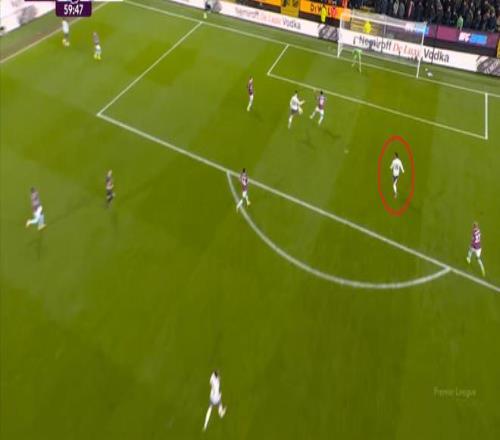 但曼联被打穿肋部是显而易见的事实,而且在局部,你可以看到曼联实际上陷入了二防三的情况,卡塞米罗无法同时防对手传球和跑位:
