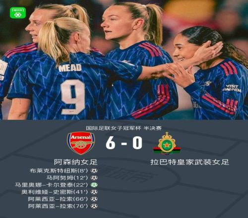 北京时间1月29日,国际足联女子冠军杯半决赛,阿森纳女足对阵拉巴特皇家武装女足。比赛中,阿莱西亚-拉索梅开二度,布莱克斯特纽斯、马阿努姆、马里奥娜-卡尔登泰、奥利维娅-史密斯分别建功。最终,阿森纳女足多点开花6-0大胜拉巴特皇家武装女足,晋级FIFA女冠杯决赛。